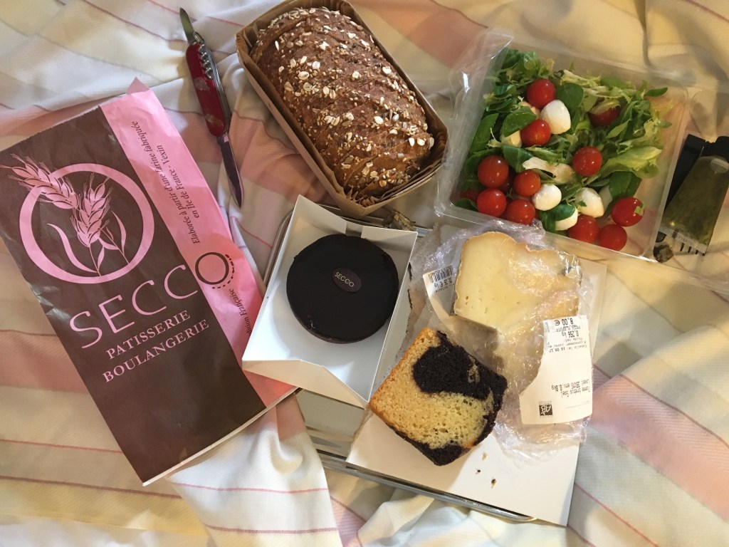 I picked an assortment of chocolate tarts and marbled cake, that were placed in a paper bag that was art. I carried all my purchases back to our room. These were the same items I’d planned for our picnic at Luxembourg Gardens– sans the wine, which wouldn’t go well with pain medicine. I spread them out on our bed and that would be our Paris picnic.