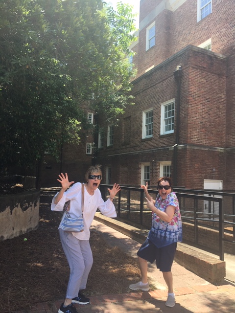 How delighted we were to see Debbie and Kay acting out their fright as we revisited the back side of the dorm, viewing the ledge that is at the top of the jutted out portion on the second floor. I wonder if there’s still pigeon poop!