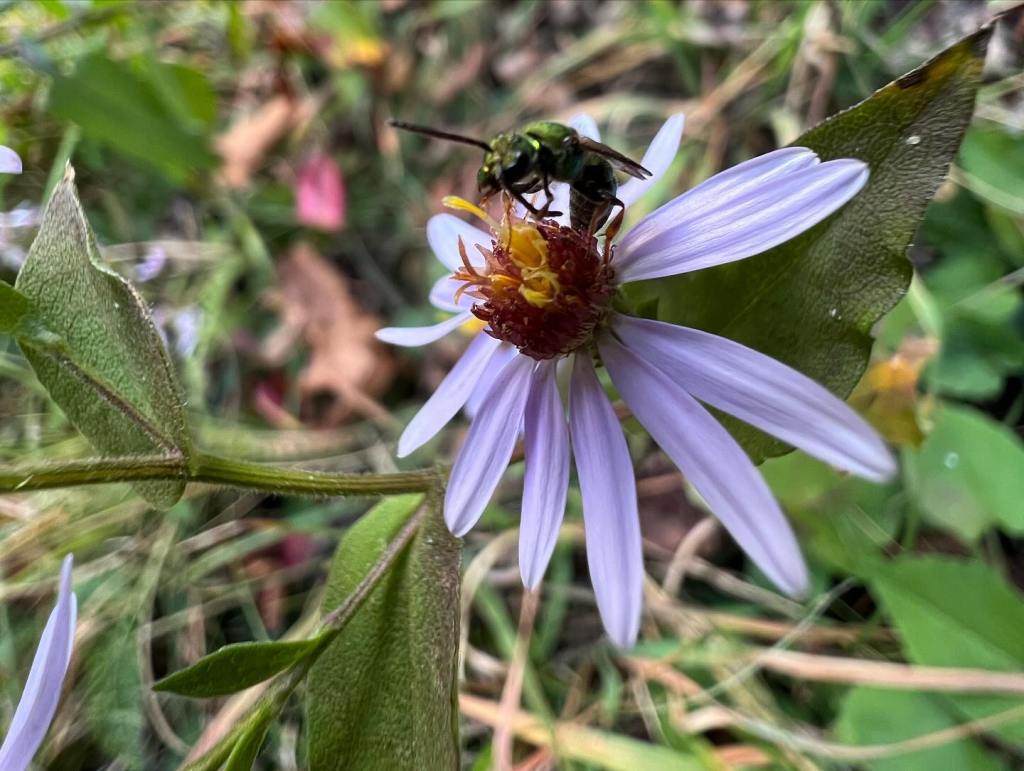 Paula remembered how much I’d loved returning to that area and chose for us to hike Bluff Mountain Trail. With our backpacks filled with water bottles, a packed lunch of peanut butter and jelly sandwiches, and our hiking poles, we took off. The weather was perfect, and hot for November at 72 degrees. The trail offered a variety of open vistas and then the cool of shaded forests. Paula has learned the native plants and we’d stop along the path for her to point out those that had faded away and those that were still in bloom, like this lovely aster.