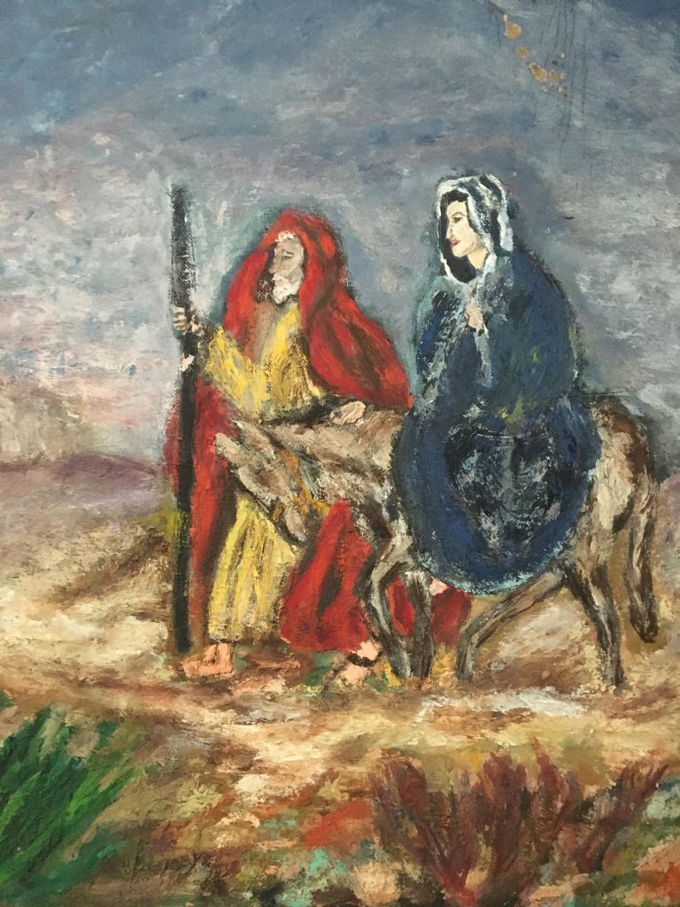 The Christmas item I display every year, and leave up until spring, is a special painting done by my Aunt Polly. I’ve told this story before, but a good story bears repeating. My Aunt Polly was Daddy’s older sister. She lived with us, when I was in 5th grade, for a couple of years, after she moved back to North Carolina from Colorado. She’d gone there in 1950 to take art classes at the University of Denver. While she told me about painting when she lived out there, I’d never seen any of her work— that is until the Christmas of 1993. At that time, she lived in a mobile home behind my mother’s house and invited me to come over. She had paintings displayed all around her living room; that was when I first saw the one of Mary and Joseph.