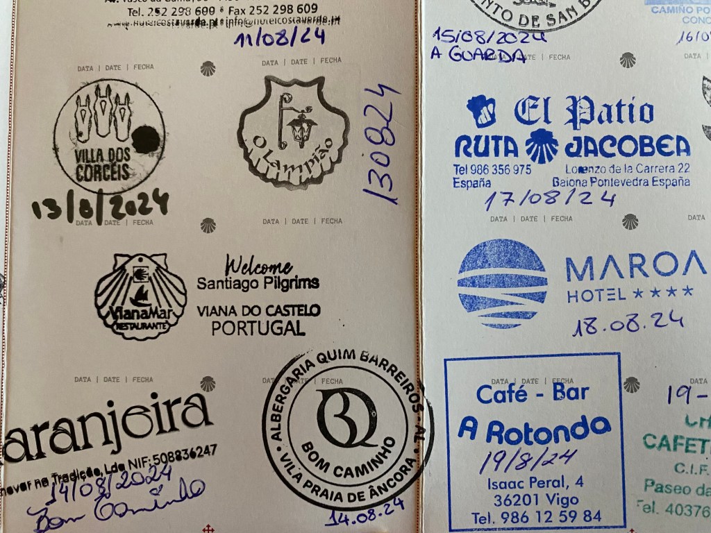 I hadn’t had time to look at all the stamps. The people who checked me in at my lodging, stamped and dated them and sometimes made encouraging comments. Lots of the bars and cafes had a self-service, self-checkout with the stamp on the bar counter. I would look at them more closely when I had time to go through my pictures and review each day of the trip.