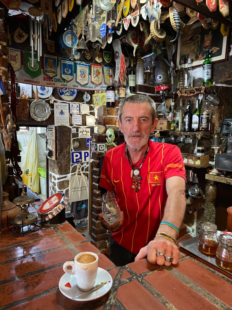 The hills of the forest and the cobblestone streets gave her the most difficulty. Finally, in the early afternoon, the heat beating down, we spotted a sign for a Pilgrim’s cafe and stopped for lunch. We were welcomed by the owner, David who wore a Vietnam Veteran shirt he’d been given by a pilgrim. In fact, the entire cafe was covered with pennants, flags, all kinds of gifts he’d been given from those walking the Camino. Not only did he bring us the soft drinks we ordered, but a plate of “biscuits” or cookies, orange marmalade, and peanuts. Later, he brought us a bottle of wine and two glasses and said, “Drink.”