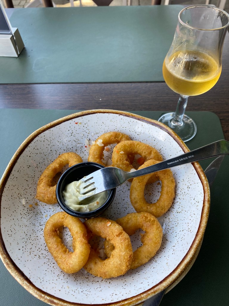 I had taken a picture of the calamari I ate in Porto–along with a glass of port that was produced in one of their vineyards. What a relaxing treat that was, eating by the Douro River. While I’m not a huge fan of calamari in the restaurants in my home area, it seems to be too chewy, what I had in Porto was different, like a cleaner, crisper bite. I’m not a food writer so I’m sure these aren’t quite the right words. Just know that the calamari there was really good.