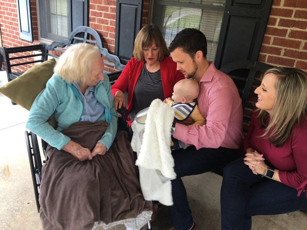 Mama meeting great-grandson, Baker and enjoying visit with Brooks and his wife, Emily Oct. 2018