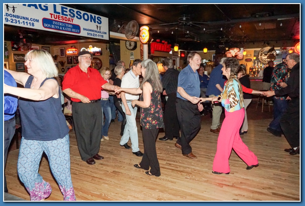 On Wednesday night, I went to the weekly After Work Mingle at Loafer’s Beach Club in Raleigh. It’s their night for “Beach, Boogie, and Blues” and the floor was packed. Most of the dancers were doing the Carolina Shag dance, that 6 count, 8 step partner swing dance to Beach music. In the Carolinas “shag” doesn’t mean the same thing as it means in the UK 🙂 The dance was developed in the 1940s in the Ocean Drive section of N. Myrtle Beach, South Carolina–and is their State Dance. I took two intro classes to learn the Carolina Shag but when the footwork became more complicated, I decided to stick to the swing dances I knew. But still, I enjoy the music and find enough partners to have fun.