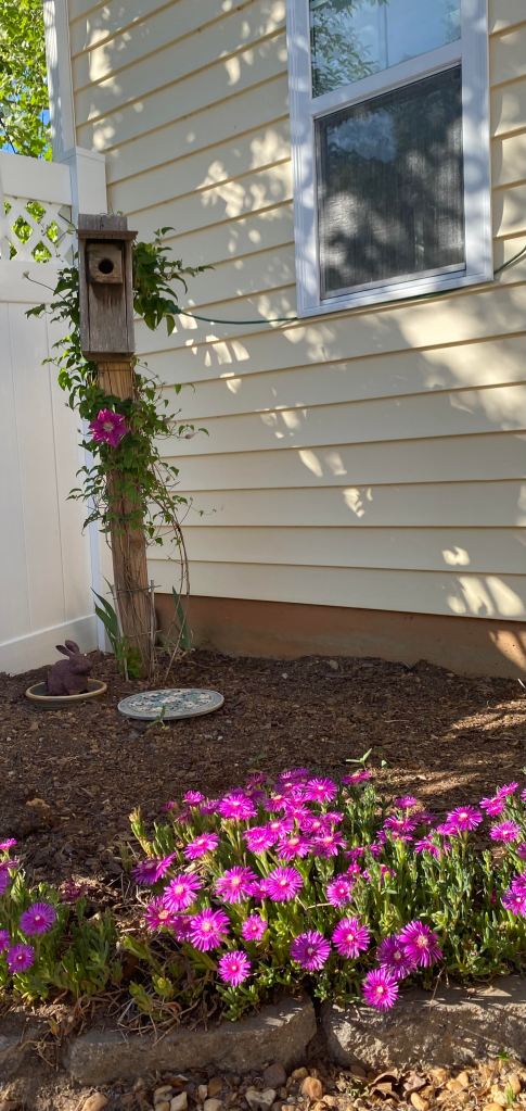 I continued my morning reflection with my second cup of coffee and more patio drama with new birds added to the scene: sparrows and a goldfinch. Still the daddy stands guard at the fence, even with these smaller creatures that aren’t as aggressive as the squirrel. The sunlight shines on the bird’s deep blue head and back, flanked by the russet brown of his chest, the perfect combination of colors. He reminds me of the words from Emily Dickinson’s poem, “Hope”: